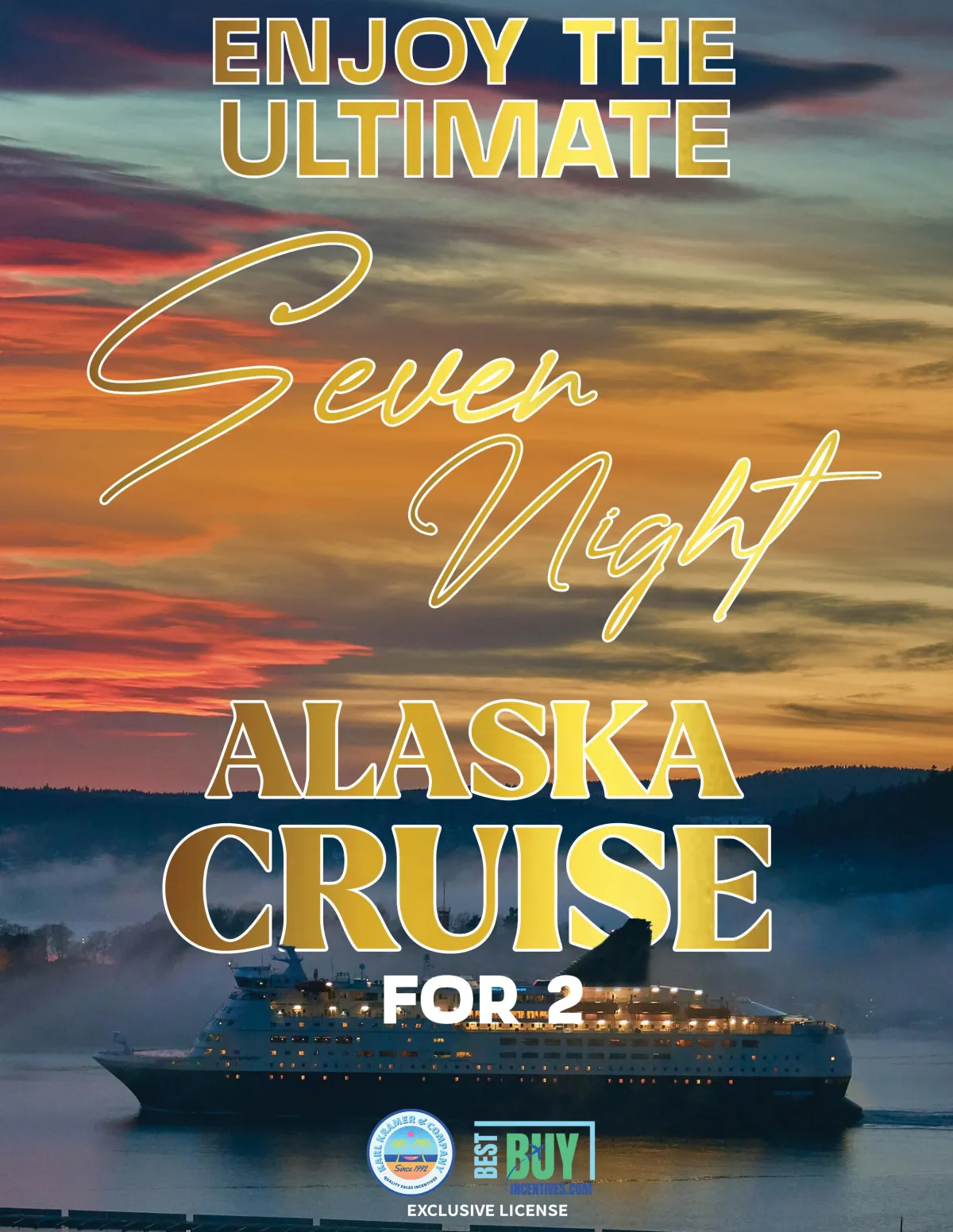 This certificate is void if bartered, sold, or transferred to another person. It is valid for a reservation registration validation form offering two adults 21 years or older, on a 7-night cruise departing from Seattle, Washington. Cruise lines include: Celebrity, Carnival®, Royal Caribbean, and MSC.